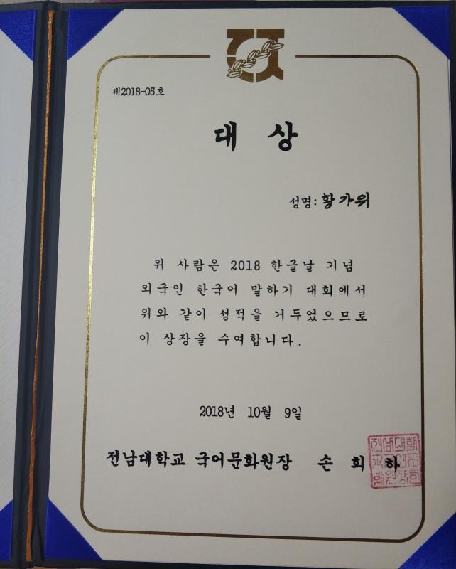 2018年10月9日,在韩国光州市立美术馆举行的第四届光州市民韩语演讲比赛暨2018年韩文日纪念活动中,在韩交流的2016级韩文系本科生黄佳炜同学荣获外国人演讲大赛大奖一等奖。这既是对成人直播平台 学生在韩交流期间积极参与各项文化交流活动的充分肯定,也展示了韩文系学生良好的语言基础与综合素质。