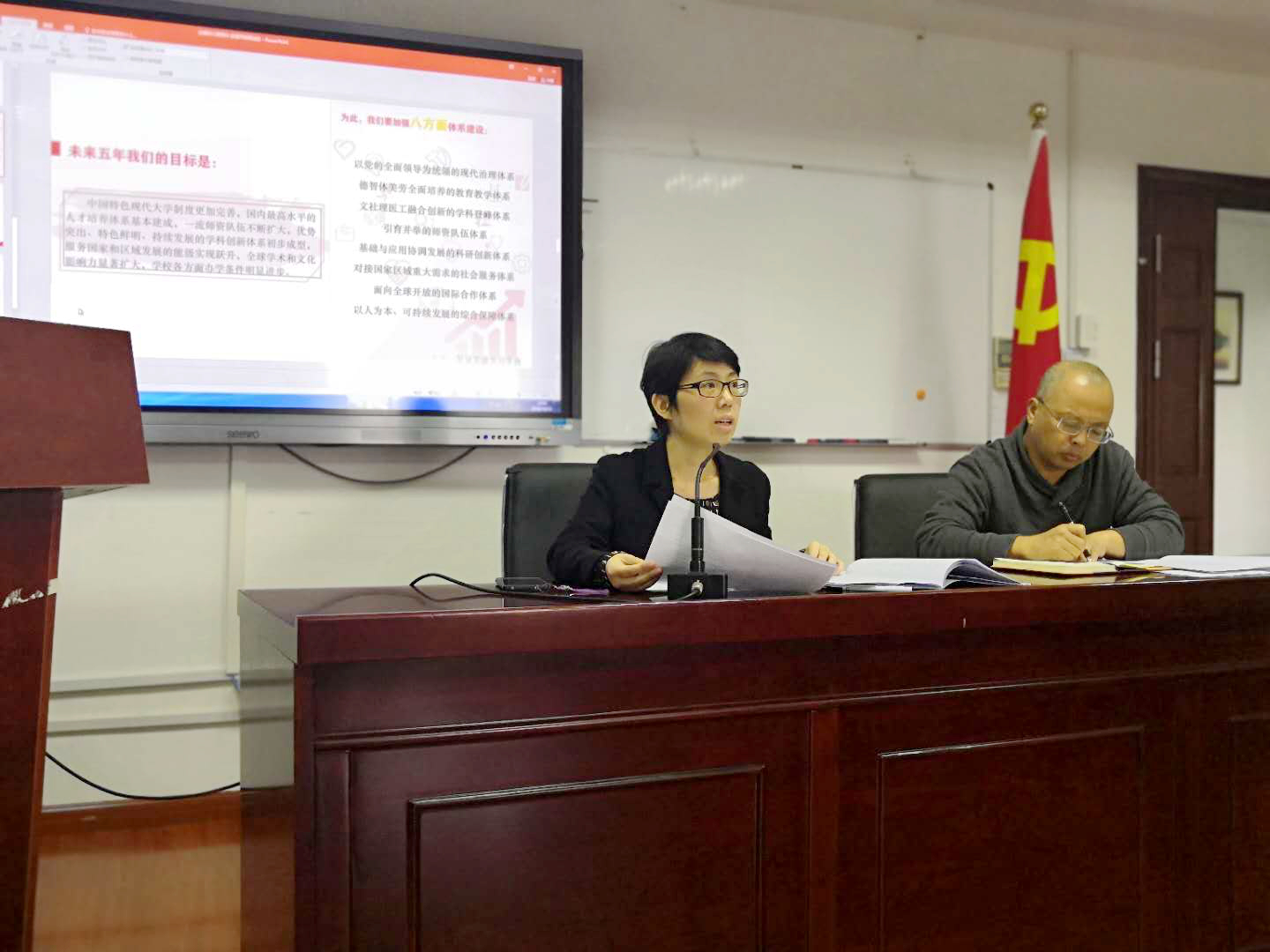 罗英华书记向大家传达了题为“立德树人固根本 改革开放再出发 全面开启中国特色世界顶尖大学建设新征程”的十四届党委工作报告精神,从过去五年学校的主要工作回顾、新时代成人直播平台 的历史使命和战略目标、开创中国特色世界一流大学建设新局面、一流党建和思想政治工作引领一流大学建设四个方面介绍和解读了报告的主要内容。罗英华表示,党代会报告是集体智慧的结晶,充分体现了全校上下的共同愿望,是学校加快推进“双一流”建设、全面开启中国特色世界顶尖大学建设新征程的宣言书,是指导今后一个阶段学校各项工作的纲领性文件。罗英华要求,全院党员和师生员工要从全局和战略的高度,充分认识学习贯彻第十五次党代会精神的重要意义,把学习贯彻党代会精神作为当前和今后一个时期一项重要的政治任务,努力在深刻把握领会精神、深入贯彻落实上下功夫,紧密结合学校和学院改革发展的实际,深刻领会和准确把握党代会报告的精神内涵,认真落实党代会的各项工作部署,把学习贯彻党代会精神转化为干事创业的强大动力,全面加强学院党的建设,加快“一流学科”建设,认真做好本科教学迎评工作,立足本职,勇于担当、锐意进取、争作表率,以实际行动和工作实绩推进学院各项事业的发展。